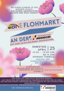 Bald ist es so weit! Am 25.04.26 findet von 10:30 – 14:00 Uhr unser zweiter BNE-Flohmarkt statt – eine tolle Gelegenheit, gemeinsam ein Zeichen für Nachhaltigkeit und Klimaschutz zu setzen.
